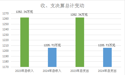 2024年度收、支总计均为1205.73万元。与2023年度1262.34万元相比,收、支总计各减少56.61万元,下降4.48%。主要变动原因是人员类基本支出减少,压减人大项目资金支出。