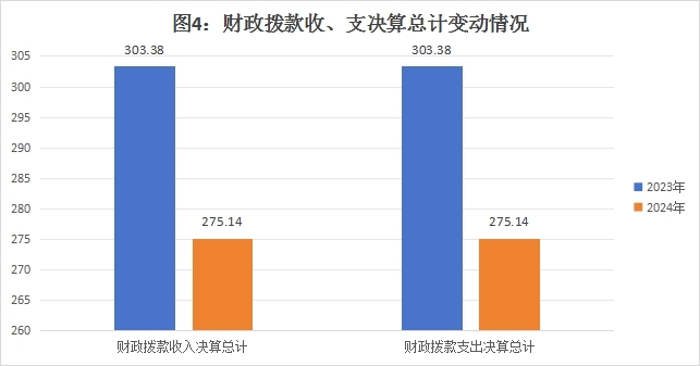 2024年度财政拨款收、支总计均为275.14万元。与2023年度303.38万元相比,财政拨款收、支总计各减少28.24万元,下降9.31%。主要变动原因是:一是2023年使用了2022年结转经费20.00万元;二是2024年部门履职经费-区委党校全区党员干部教育培训、党校分类办学、师资队伍培训等经费较上年减少6.20万元;三是较上年减少了中人一次性退休补贴及退休人员职业年金缴费。