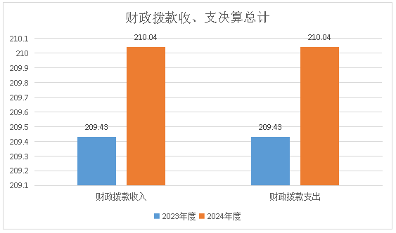 2024年度财政拨款收、支总计均为210.04万元。与2023年度相比,财政拨款收、支总计各增加0.61万元,增长0.29%。主要变动原因是人员增加。