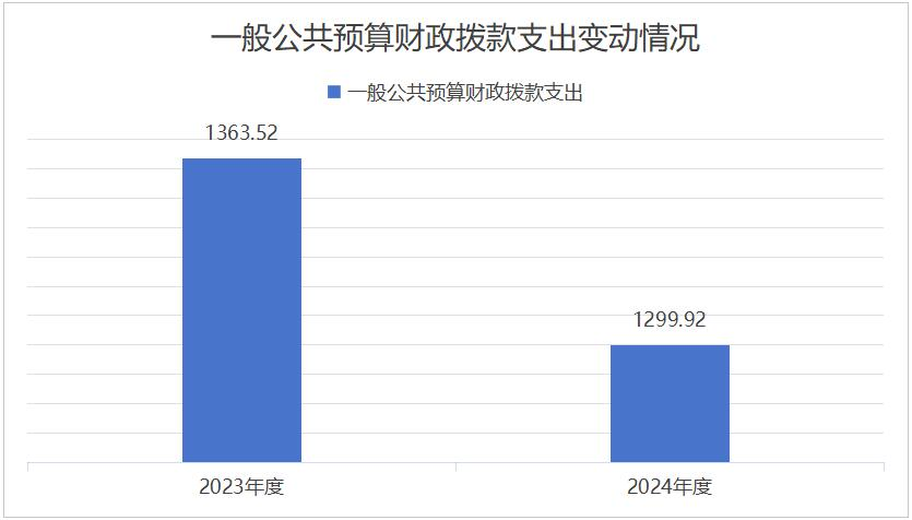 2024年度一般公共预算财政拨款支出1299.92万元,占本年支出合计的87.84%。与2023年度相比,一般公共预算财政拨款支出减少63.6万元,下降4.66%。主要变动原因是部门项目减少。