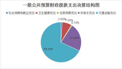 2024年度一般公共预算财政拨款支出6896.08万元,主要用于以下方面:社会保障和就业支出72.61万元,占1.05%;卫生健康支出520.55万元,占7.55%;住房保障支出49.47万元,占0.72%;农林水支出1564.33万元,占22.68%;交通运输支出4689.11万元,占68.00%。