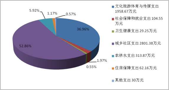 2024年度一般公共预算财政拨款支出5299.87万元,主要用于以下方面:文化旅游体育与传媒支出1958.67万元,占36.96%;社会保障和就业支出104.55万元,占1.97%;卫生健康支出29.25万元,占0.55%;城乡社区支出2801.38万元,占52.86%;农林水支出313.87万元,占5.92%;住房保障支出62.16万元,占1.17%;其他支出30万元占0.57%。