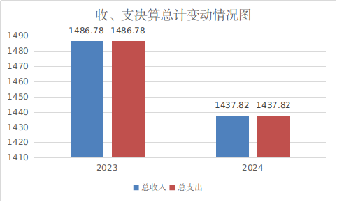 2024年度收、支总计均为1437.82万元。与2023年度相比,收、支总计各减少48.96万元,下降3.30%。主要变动原因是2024年项目收入支出较上年减少。