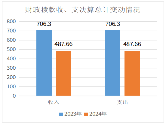2024年度财政拨款收、支总计均为487.66万元。与2023年度相比,财政拨款收、支总计各减少218.64万元,下降30.96%。主要变动原因是项目收支减少。