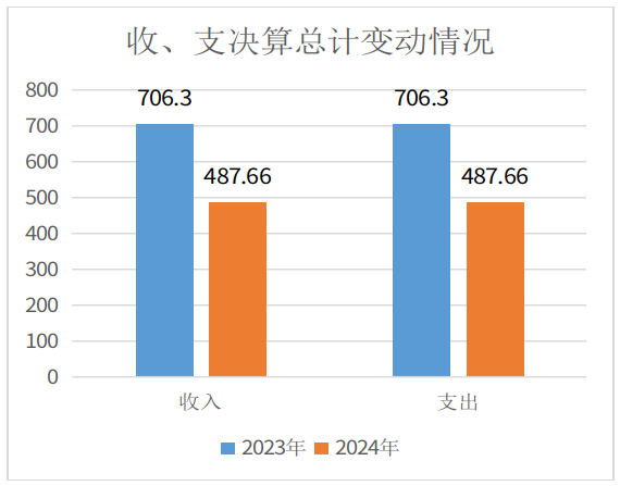 2024年度收、支总计均为487.66万元。与2023年度相比,收、支总计各减少218.64万元,下降30.96%。主要变动原因是项目收支减少。