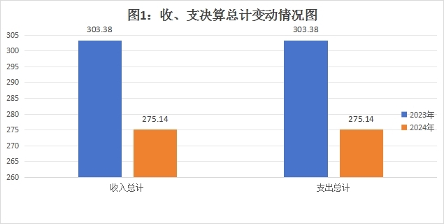 2024年度收、支总计均为275.14万元。与2023年度303.38万元相比,收、支总计各减少28.24万元,下降9.31%。主要变动原因是:一是2023年使用了2022年结转经费20.00万元;二是2024年部门履职经费-区委党校全区党员干部教育培训、党校分类办学、师资队伍培训等经费较上年减少6.20万元;三是较上年减少了中人一次性退休补贴及退休人员职业年金缴费。