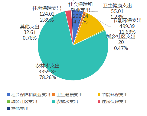 2024年度一般公共预算财政拨款支出4293.09万元,主要用于以下方面社会保障和就业支出202.24万元,占4.71%;卫生健康支出55.01万元,占1.28%;节能环保支出499.39万元,占11.63%;城乡社区支出20万元,占0.47%;农林水支出3359.83万元,占78.26%;住房保障支出124.02万元,占2.89%;其他支出32.61万元,占0.76%。