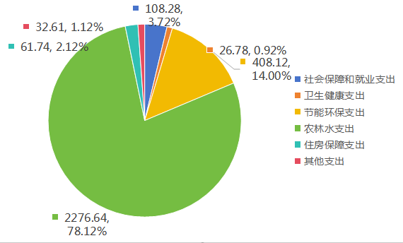 2024年度一般公共预算财政拨款支出2914.16万元,主要用于以下方面:社会保障和就业支出108.28万元,占3.72%;卫生健康支出26.78万元,占0.92%;节能环保支出408.12万元,占14.00%;农林水支出2276.64万元,占78.12%住房保障支出61.74万元,占2.12%;其他支出32.61万元,占1.12%。