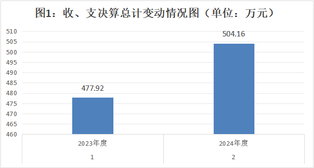2024年度收、支总计均为504.16万元。与2023年度477.92万元相比,收、支总计各增加26.24万元,增长5.49%。主要变动原因是工作经费增加。