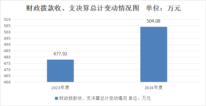 2024年度财政拨款收、支总计均为504.08万元。与2023年度相比,财政拨款收、支总计各增加26.24万元,增长5.49%。主要变动原因是工作经费增加。