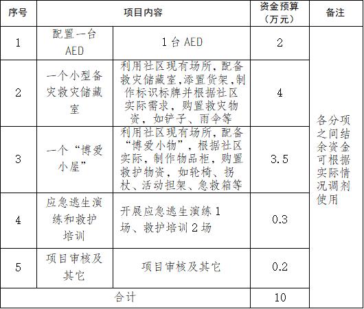 项目预算金额为10万元,资金来源为2025年第二批中央专项彩票公益金支持地方社会公益事业发展资金项目——“四川省革命老区城镇社区博爱家园项目”专项资金。资金将按照《政府采购法》及相关规定进行使用,确保资金使用的透明和合规。资金主要用于设备采购、储备物资、培训活动及设施建设。具体的预算安排如下: