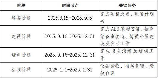 (一)AED 配置与培训目标:2025年12月底前完成一台AED配置,组织项目点相关人员参加AED正确使用培训,确保相关人员熟练掌握操作技能,为心脏骤停患者的及时抢救提供有力支持。