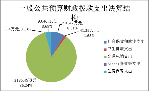2024年度一般公共预算财政拨款支出2534.18万元,主要用于以下方面:社会保障和就业支出210.47万元,占8.31%;卫生健康支出41.39万元,占1.63%;交通运输支出2185.45万元,占86.24%;商业服务业等支出3.4万元,占0.13%;住房保障支出93.46万元,占3.69%。